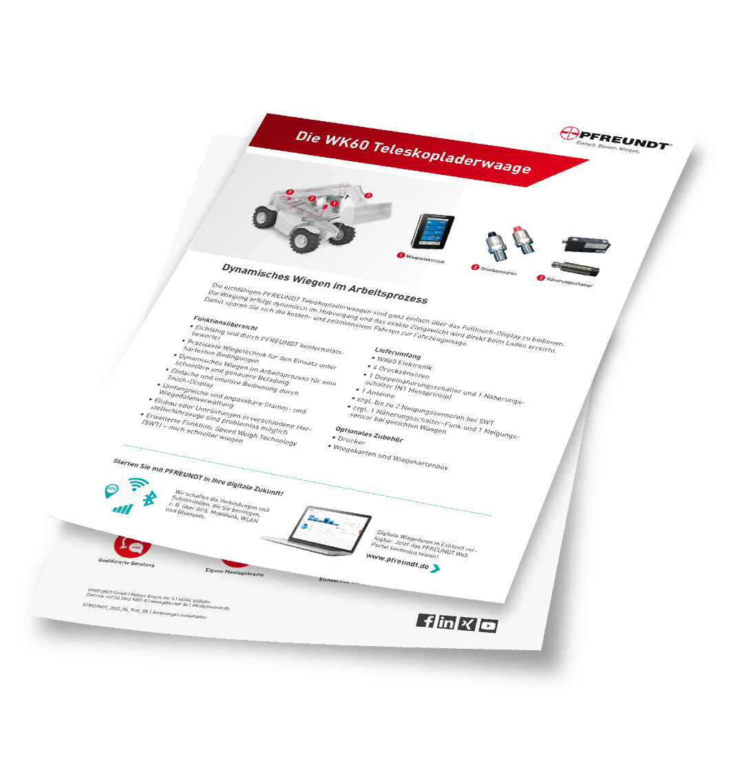 Vielseitig, dynamisch und exakt! Die eichfähigen PFREUNDT Teleskopladerwaagen sind ganz einfach über das Fulltouch-Display zu bedienen. Die Wiegung erfolgt dynamisch im Hubvorgang und das exakte Zielgewicht wird direkt beim Laden erreicht. Damit sparen Sie sich die kosten- und zeitintensiven Fahrten zur Fahrzeugwaage.